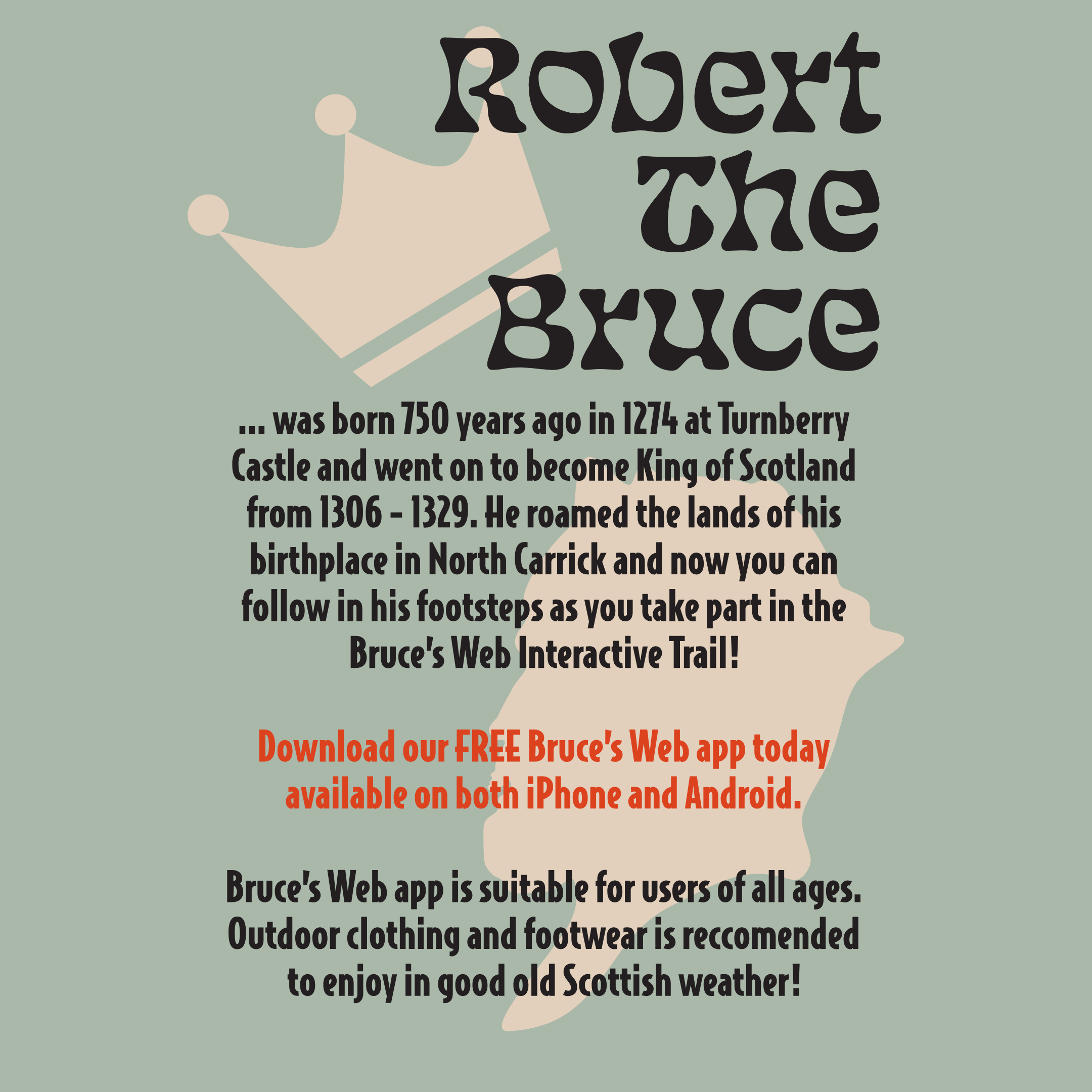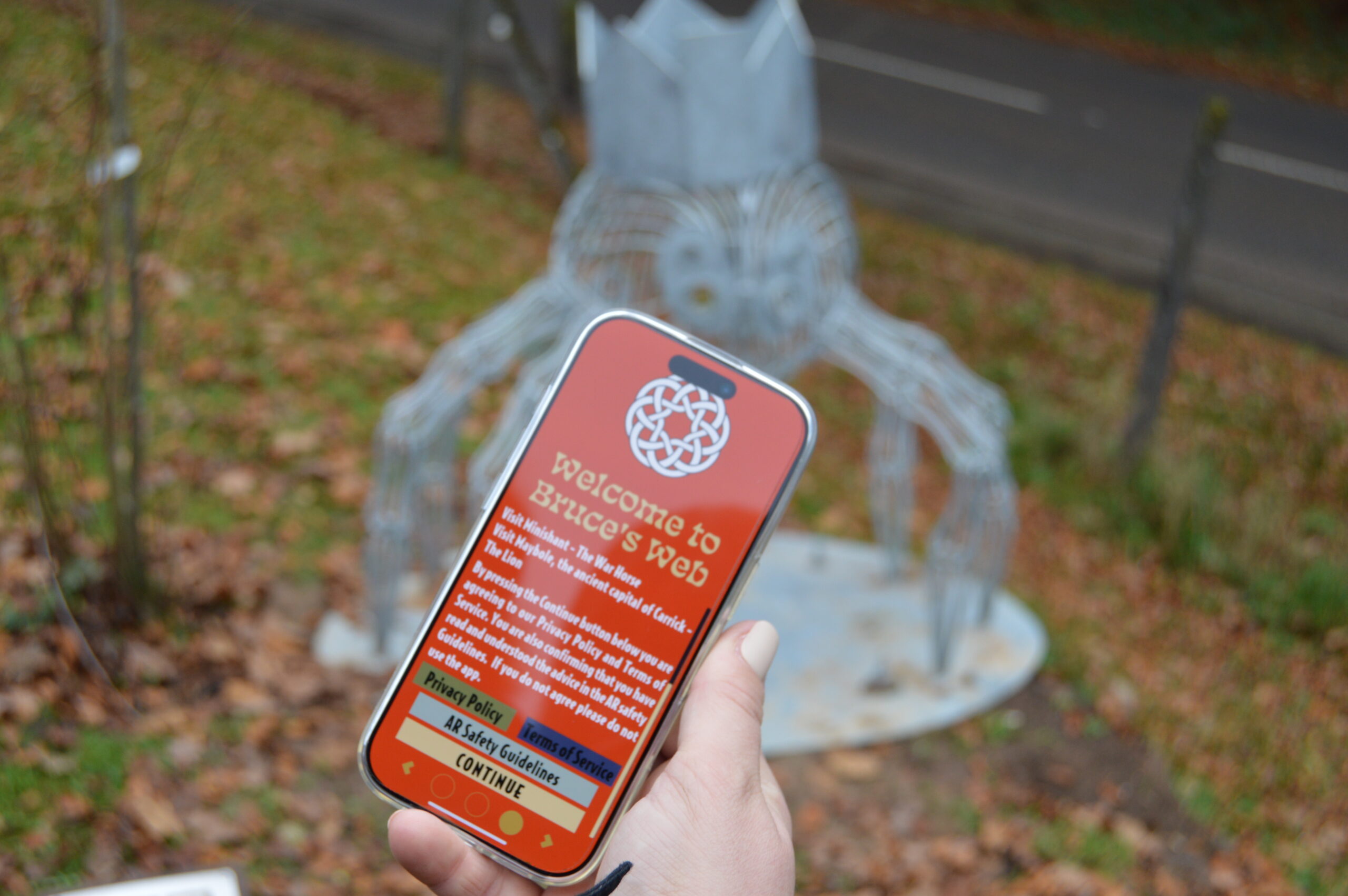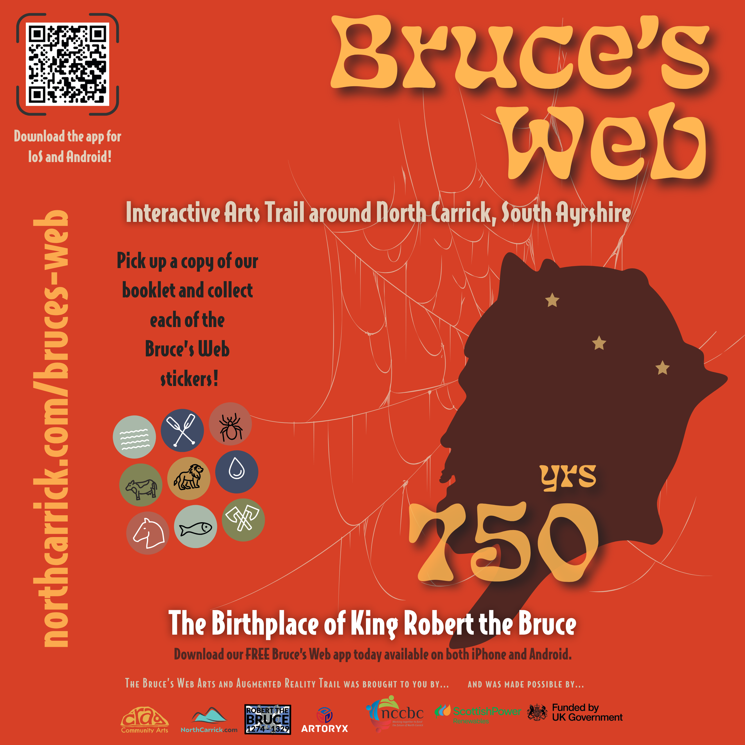 The creation of the Bruce’s Web eight village sculptures and Bruce’s Web mobile app was commissioned by North Carrick Community Benefit Company and awarded to CRAG Community Arts SCIO led by Girvan based artist David Powell. As trail-goers make their way around each location, they will seek out outdoor art which includes fun sculptures such as a giant spider and a war horse. Each piece of art carries a unique QR code for users to scan via the app, creating augmented reality imagery in the setting where they stand. The free and family friendly app also tells of Bruce’s historical links with each location and features a fun ‘Quest For The Crown’ game suitable for all ages.