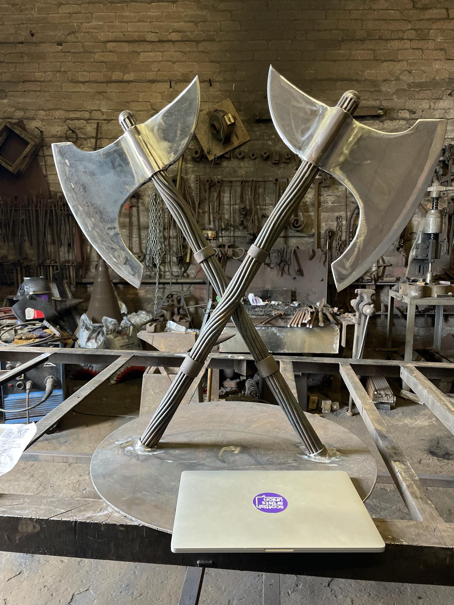 Artist David Powell, renowned for his work in willow and steel, including popular sculptures at Culzean Country Park, Rozelle Park and Eglinton Park led the project with a project team including Ross Graham (Artoryx – app design), Jacqueline Ross (clever river – copywriting and business engagement) and Mary Jean Govan (CRAG Community Arts – community engagement). The process began with an important period of community engagement. CRAG worked with schools and youth groups in the area inspiring the children with their local history and encouraging them to create models of what they would like to see in their village. Each community was then asked to vote for their favourite. The chosen models were then worked up into the finished designs - hand bent, cut and welded into unique artworks over a 4-month period. Each piece offering a challenge in technique and execution. All the eight village pieces have been created by artist David Powell with David commissioning Morells Forge in Maidens to produce the ‘Twa Aixes’ and Jamiesons Welding in Girvan to fabricate the three corten steel forms.